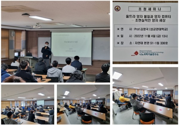 국내학자 초청세미나(22.11.04) - Prof.김영국 관련링크 목록 본문 국내학자 초청세미나(22.11.04) - Prof.김영국 1.세미나일자: 2022.11.04.13시(S1-1동 336호)2.연사자: Prof.김영국3.소속: 성균관대학교4.주제: 울트라 양자 물질과 양자 컴퓨터 − 초현실적인 양자 세상 목록